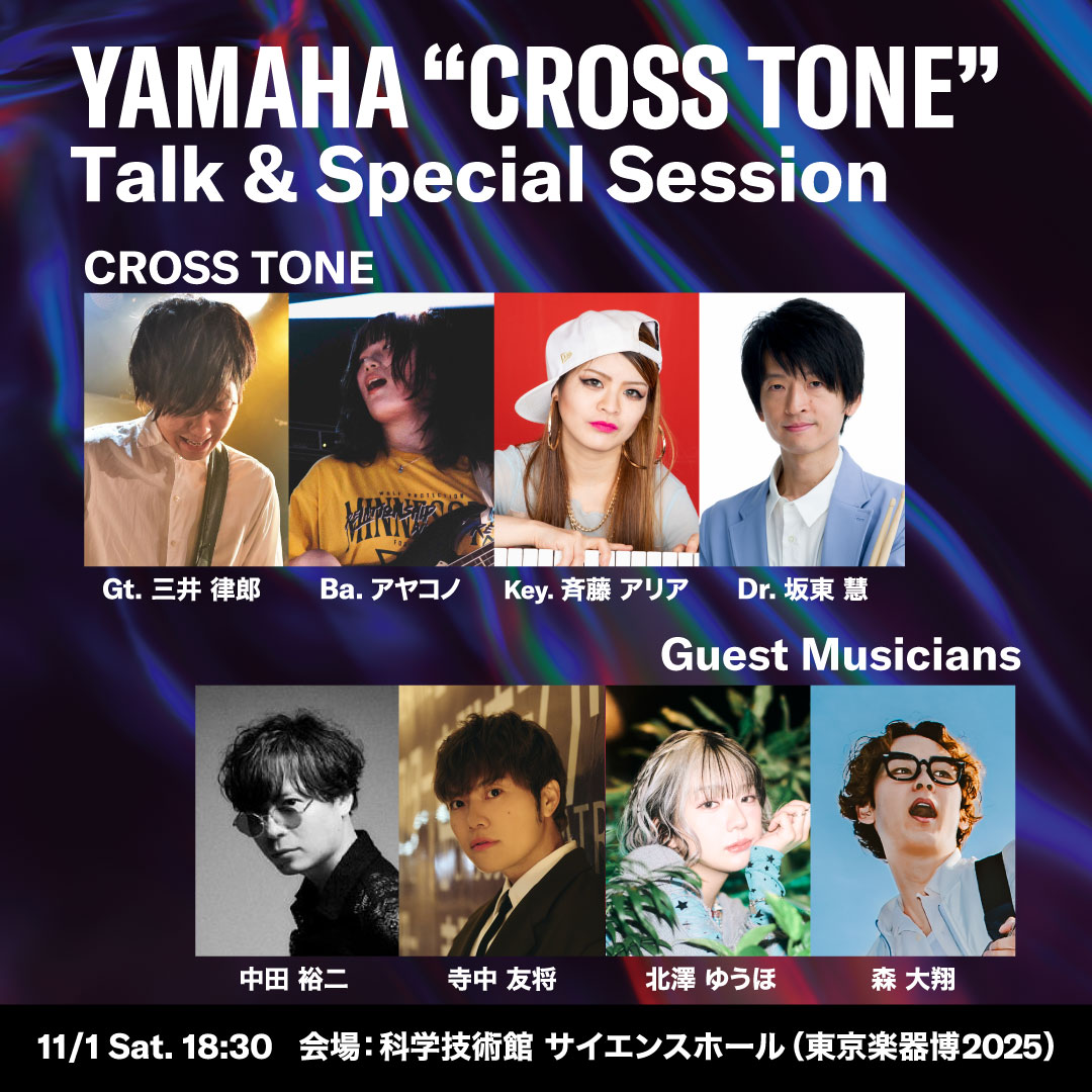 ヤマハの楽器を使用するミュージシャンたちが一夜限りの限定バンド“Cross Tone”を結成!バンドとしてゲストシンガー、ミュージシャンを招いて多彩な楽曲演奏をお送りするスペシャルイベント。ここでしか聴けないミュージシャンたちのコラボ・セッションライブを、東京楽器博2025ならではのトークも交えながらお届けします。