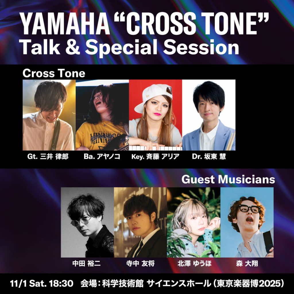 ヤマハの楽器を使用するミュージシャンたちが一夜限りの限定バンド“Cross Tone”を結成!バンドとしてゲストシンガー、ミュージシャンを招いて多彩な楽曲演奏をお送りするスペシャルイベント。ここでしか聴けないミュージシャンたちのコラボ・セッションライブを、東京楽器博2025ならではのトークも交えながらお届けします。